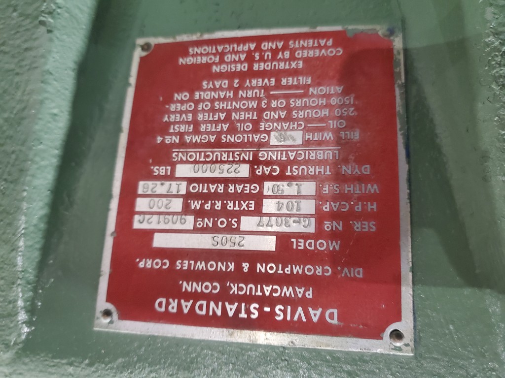 | Item 6410-2 - One (1) Used Gearbox for Davis Standard 2.5" Cold Feed Rubber Extruder, PFR power feed roll type, 17.26:1 G/B ratio, model 250S, SN G-3077, 104 HP Capacity | ||||