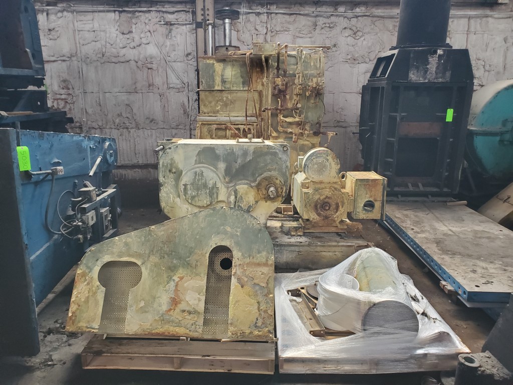 | Item 1024 – One (1) Used Moriyama Sanyu 55L Liter Litre Tilt Mixer, model DX55-200, 200 HP, 1170 RPM, 460 VAC motor, tilt discharge, heavy duty direct drive 24.906:1 Sumitomo gearbox, heavy duty tangential 2-wing rotors for rubber and silicone applications, pneumatic hopper, unitized base, mechanical seal dust stops, cooling jackets for chamber, rotors and floating weight. | ||||