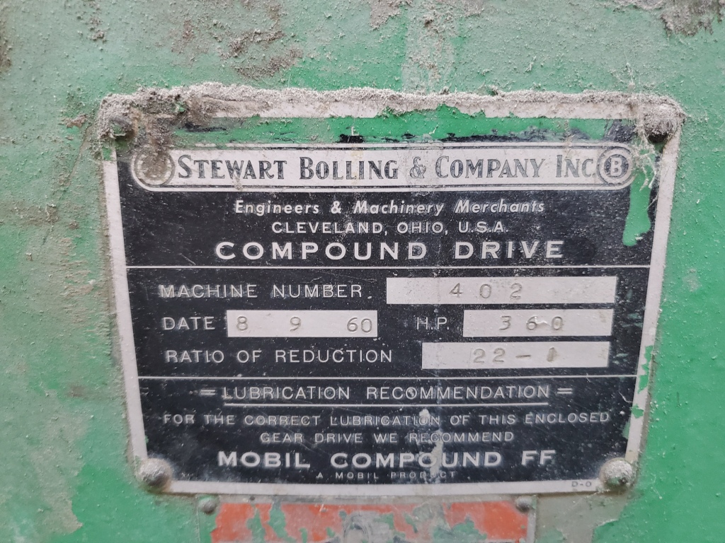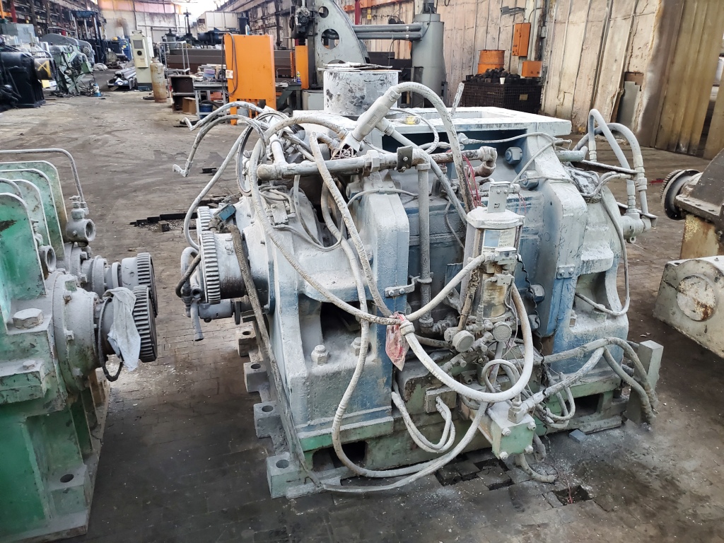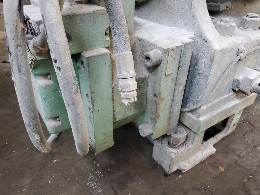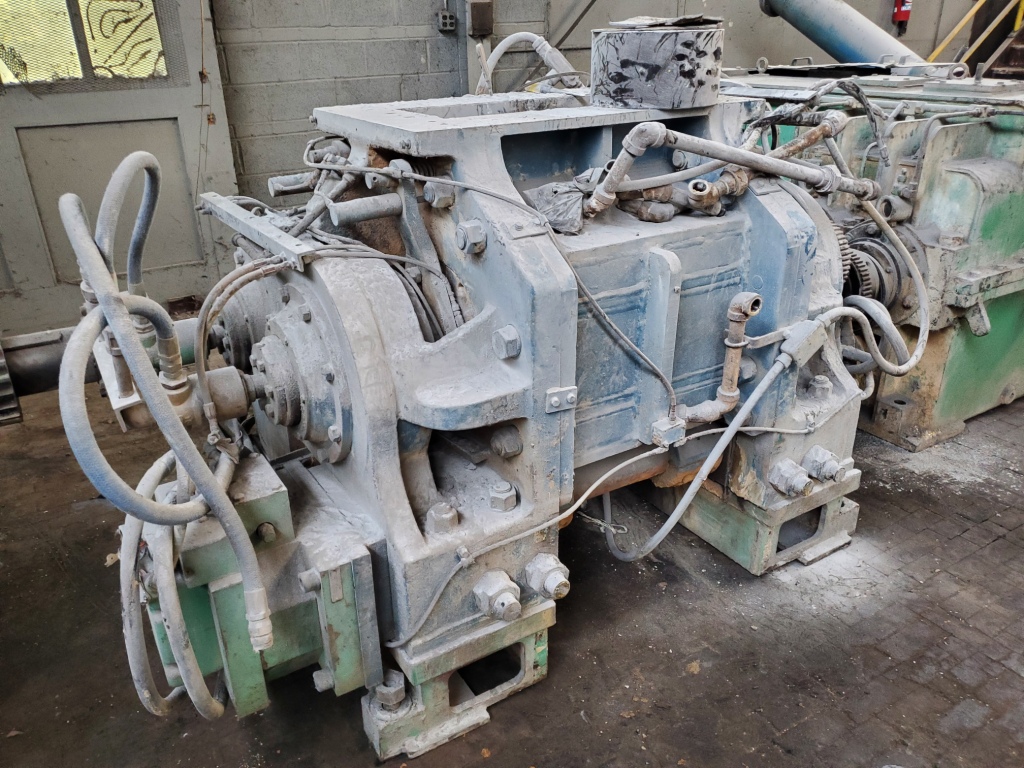 | One (1) Used Bolling #4 Rubber Mixer, 80 liter, 150 lb batch, gearbox Bolling unidrive double reduction horizontal parallel shaft mixer speed reducer, arrangement L-RR, 22:1 reduction ratio, 55-80 RPM, pneumatic hopper, hydraulic dust seals, 2 wing rotors, no motor or electrical panels | ||||