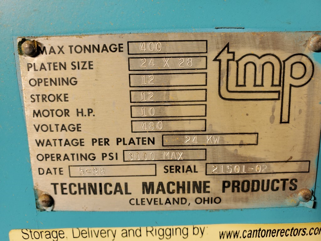 | Item 3082 - One (1) Used TMP 24” x 28” press, 400 ton, 12” daylight between platens, 12” stroke, (1) electric platen, incomplete self contained hydraulic unit, incomplete controls | ||||