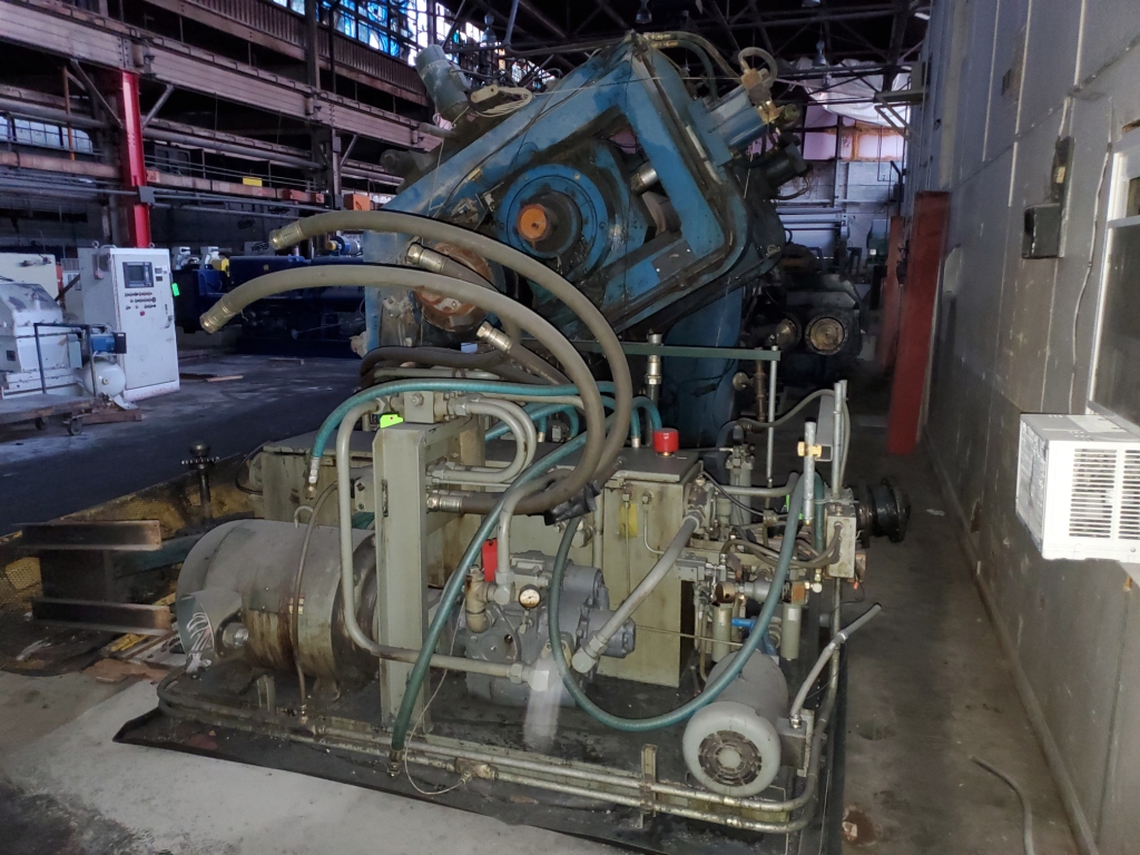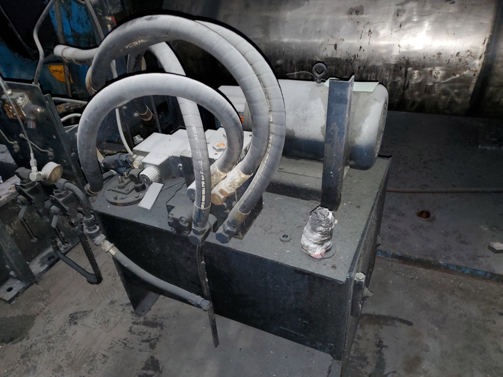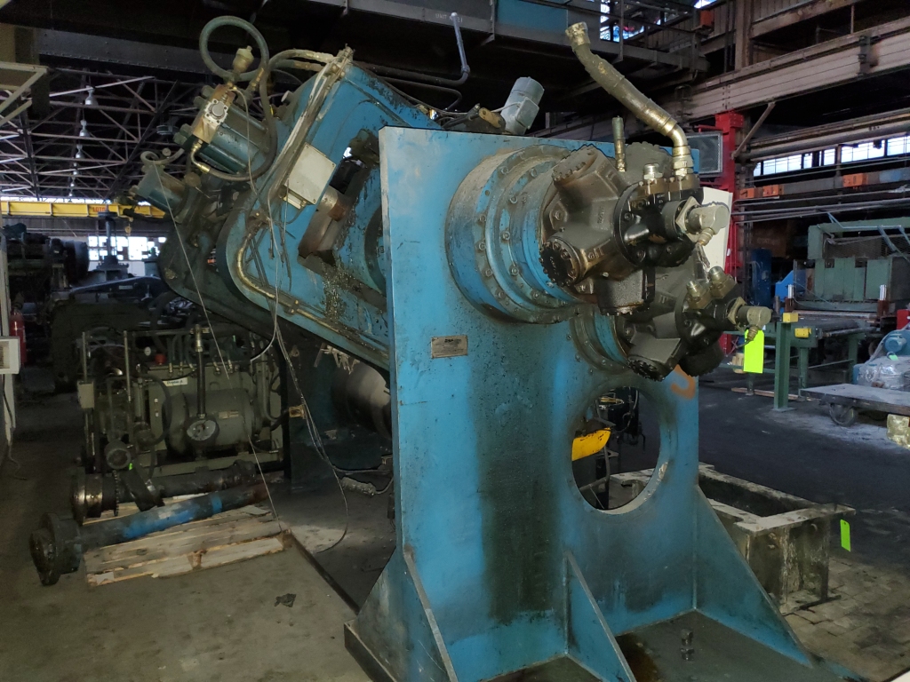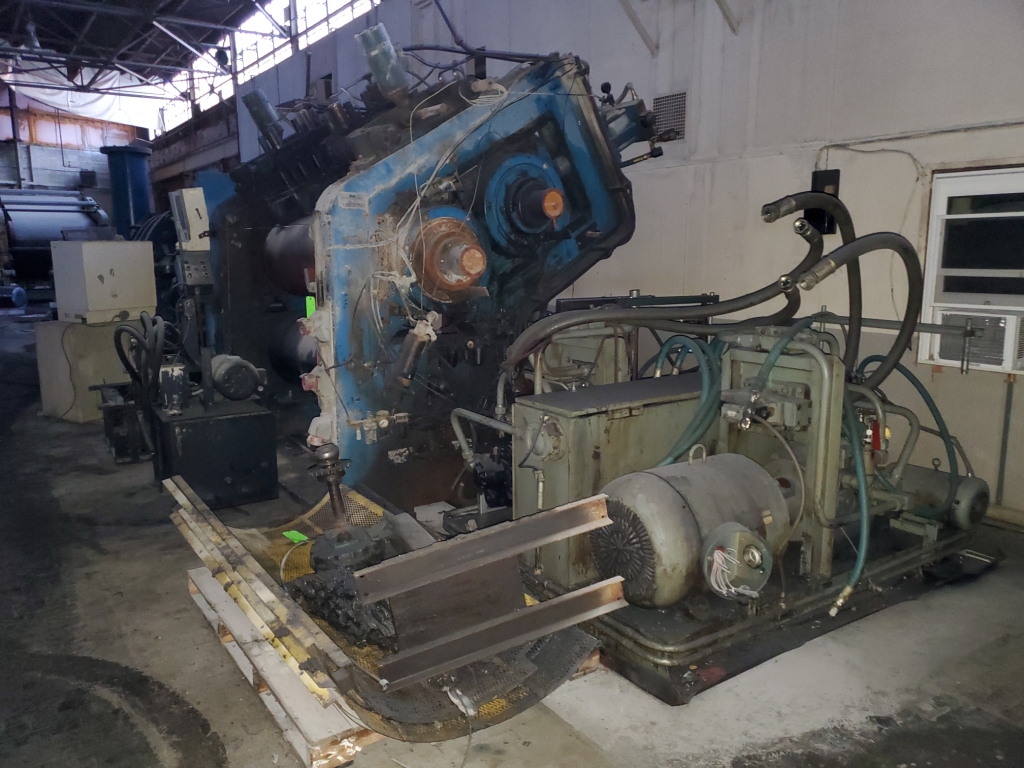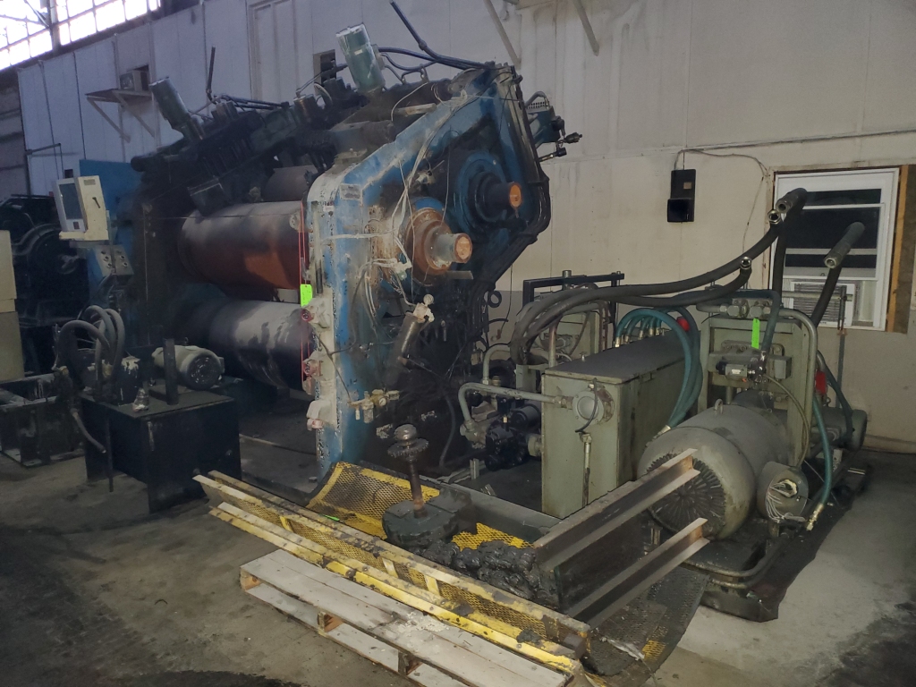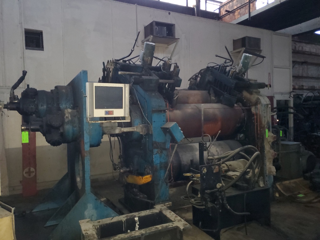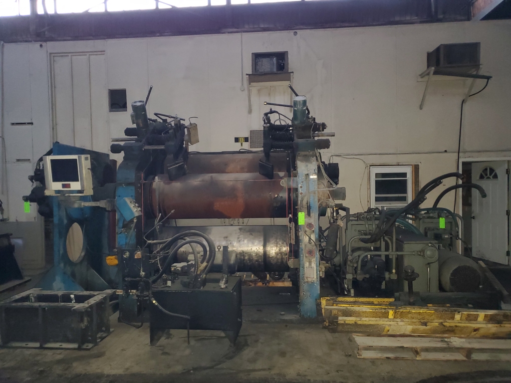 | One (1) Used Akron Steel Fabricators 24x68" 2-Roll Calender, Vickers individual hydraulic drives for top and middle drilled rolls, individual Lincoln 100 HP 460 VAC for each roll (total 200 HP), anti-friction roller bearings, bottom roll is a jacketed cooling drum, pneumatic plow stock guides, hydraulic nip adjustment, fabricated end frames | ||||