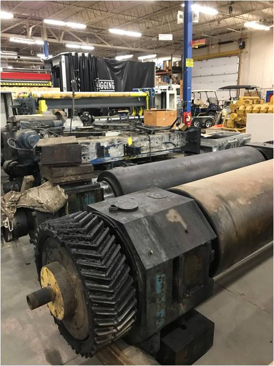 | One (1) Used Stewart Bolling 32” x 120” 2-Roll Rubber Calender, cored rolls, 100 HP 500 VDC electric motor, belt drive between motor and gearbox, Lufkin model T-1280 gearbox with 214:1 reduction ratio, direct drive between gearbox and bottom roll, zero-clearance pullback cylinders, bronze bushings, motorized nip adjustment top roll 2-speed 5/1 HP motors with cone drive 3600:1 reduction ratio, motorized roll crossing top roll with spindle type connecting gears, ideal for roofing or flooring applications | ||||
